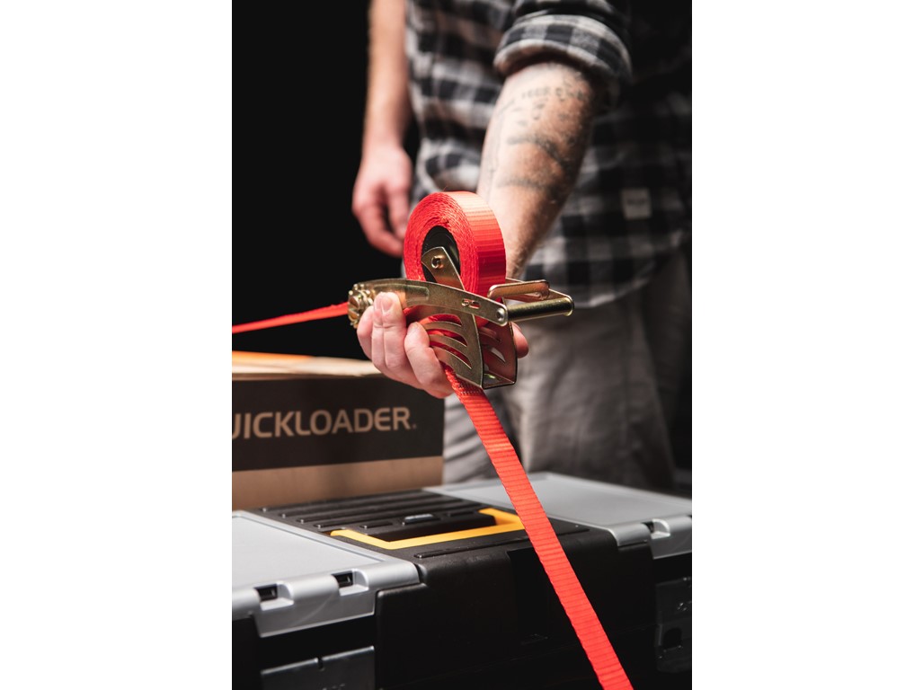 Zajišťovací systém QUICKLOADER® s nosností až 4000 kg, délkou 8 m (v rozsahu 1,0 až 7,0 m) a šířkou 50 mm je navržen pro nejnáročnější pracovní nasazení. Spolehlivě zvládne zabezpečení těžkých strojů, materiálů, palet nebo objemného vybavení během transportu – ať už na valníku, v kontejneru nebo nákladním automobilu.