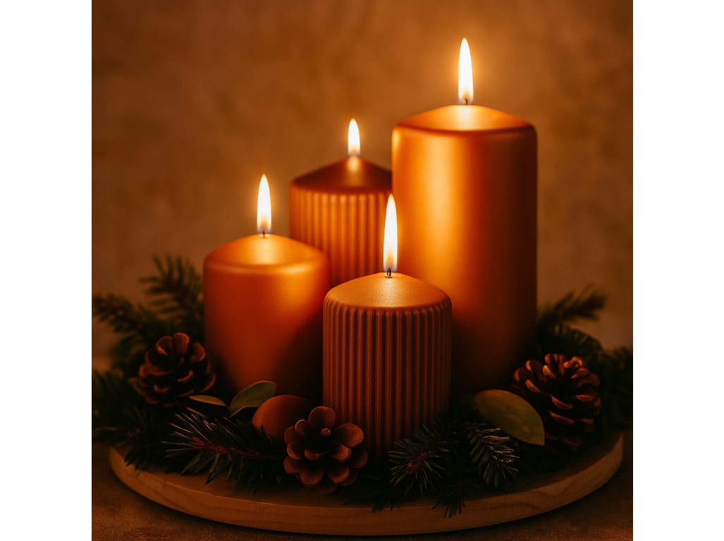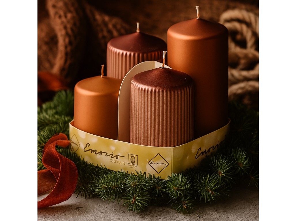 Sada čtyř válcových svíček Emocio o průměru 65 mm kombinuje hladké a rýhované provedení. Metalický mat dodává dekoraci sofistikovaný a elegantní vzhled. Ideální pro stolní aranžmá, adventní dekorace nebo samostatné vystavení.