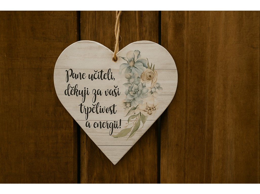 Krásný a srdečný dárek, kterým vyjádříte vděčnost panu učiteli za jeho trpělivost, podporu a vedení. Dřevěné srdce o velikosti 120 mm je ozdobeno jemným potiskem s nápisem „Pane učiteli, děkuji…“, který zahřeje u srdce a zanechá trvalou vzpomínku.Vyrobeno z přírodního dřeva, doplněno o jutový provázek pro snadné zavěšení – například na kliku dveří, nástěnku nebo jako dekorace do pracovny. Ideální drobný dárek na konec školního roku nebo jako milá pozornost kdykoliv během něj.