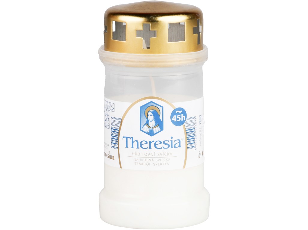 Litá svíčka Theresia s víčkem v bílé barvě, hoří až 2 dny.