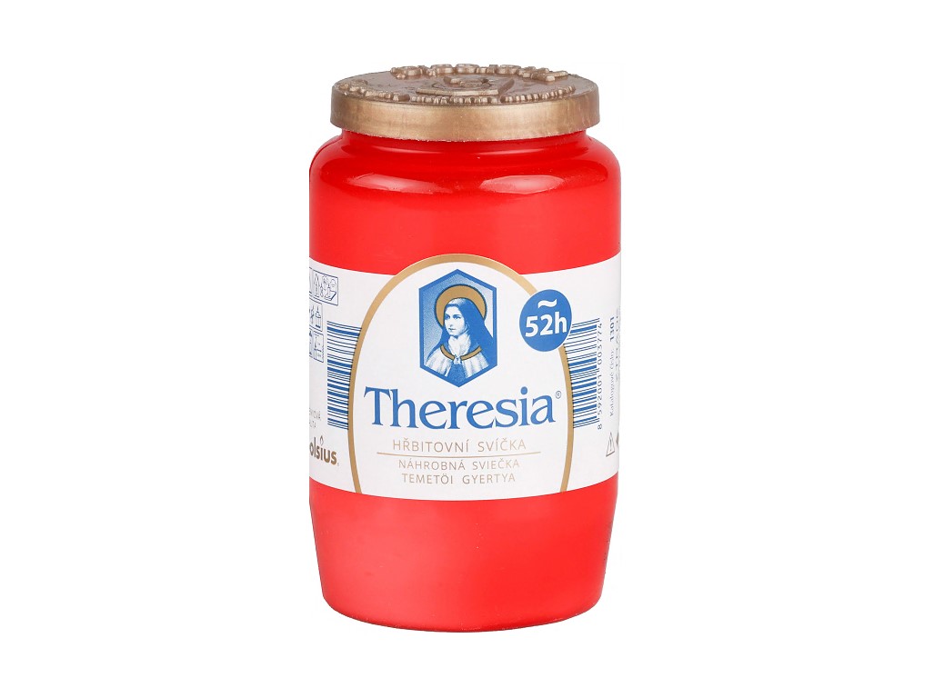 Kompozitní svíčka Theresia v červené barvě, ideální pro výzdobu hrobů. Hoří až 2,5 dne.