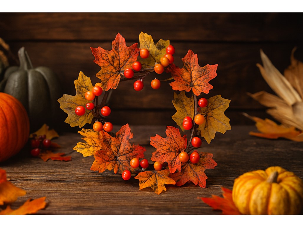 Dekorační věnec laděný do podzimních barev s realistickými javorovými listy a bobulemi. Vhodný na dveře, stěnu či stůl. Vnese do vašeho domova hřejivou atmosféru podzimu. Zavěšení je snadné díky pevnému poutku.