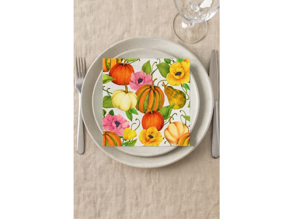 Stylové ubrousky s jemným motivem dýní a máků pro slavnostní i běžné podzimní stolování. Balení obsahuje 20 ks třívrstvých ubrousků o rozměru 33 × 33 cm.