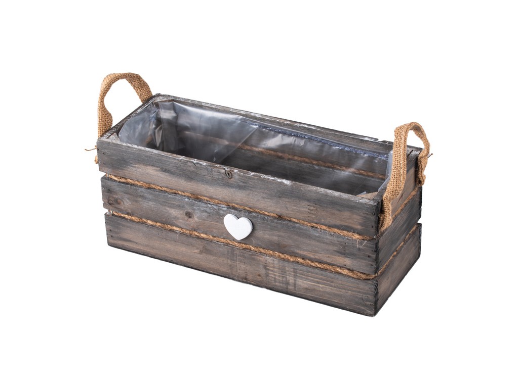 Elegantní šedá dřevěná bedýnka s uchy z pytloviny o rozměrech 300x120x125mm je perfektní pro dekorace a dárkové balení, které může obsahovat květinu. Vnitřek bedýnky je totiž potažen igelitovou výstelkou. Díky své prostornosti pojme i větší předměty a její elegantní design z ní dělá stylový doplněk do každého interiéru.
