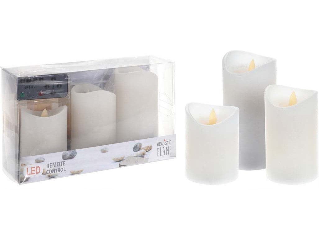 Sada tří bílých LED svíček o rozměrech 75 × 100, 75 × 125 a 75 × 150 mm s reálným plamenem a časovačem nabízí bezpečné a realistické svícení. LED světlo imituje skutečný plamen, čímž vytváří příjemnou a hřejivou atmosféru. Svíčky lze umístit samostatně nebo společně pro elegantní aranžmá na stůl či parapet. Praktický časovač zajišťuje pohodlné používání. Ideální pro domácí dekorace a vánoční výzdobu.