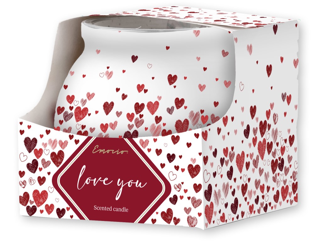 Vonná svíčka Emocio s motivy srdíček ve velkém skle s víčkem – elegantní dárek od srdce.
