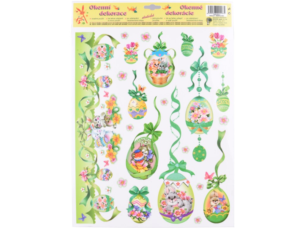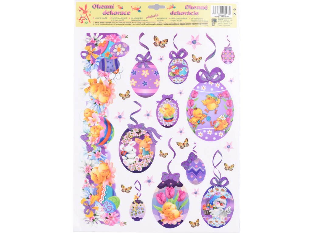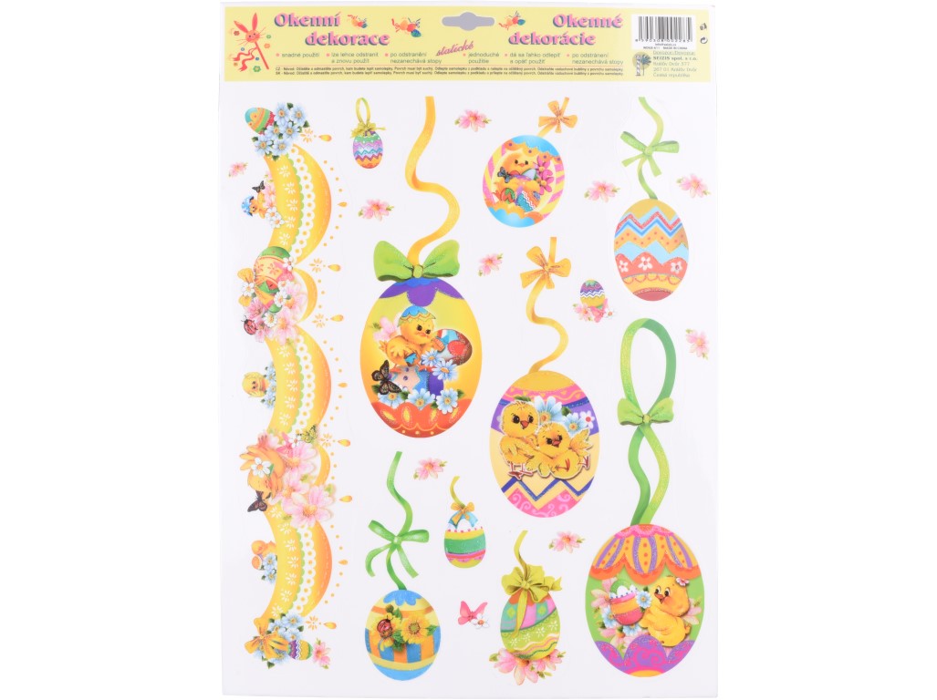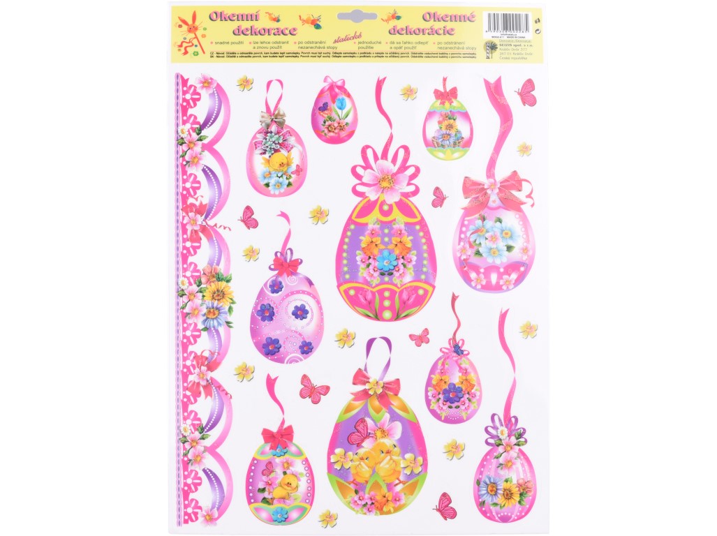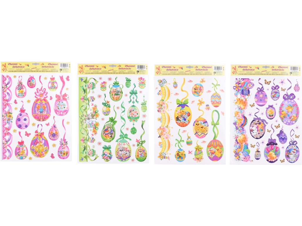 Dekorační okenní fólie s motivem třpytivých vajíček o rozměru 410×290 mm je ideální volbou pro jarní a velikonoční výzdobu. Díky statickému přilnutí se snadno aplikuje na sklo bez lepidla a lze ji opakovaně přemisťovat. Třpytivé prvky dodávají motivům jemný zářivý efekt, který krásně vynikne na světle. Fólie je vhodná na okna, skleněné dveře i vitríny. Mix různých designů umožňuje vybrat motiv, který nejlépe doladí tvou sezónní dekoraci.
