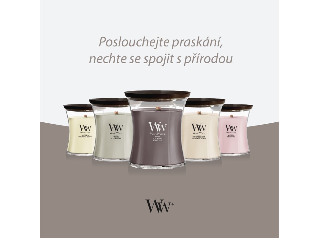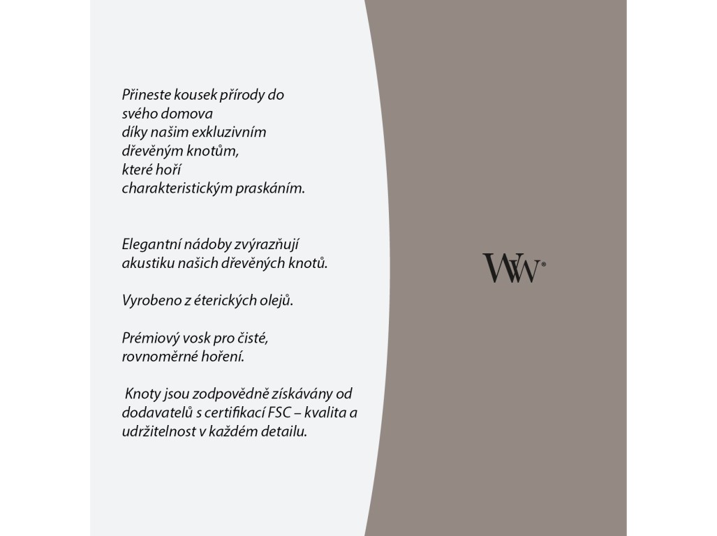 Loď je nejvýraznějším provedením WoodWick a smyslovým středobodem prostoru. Její protáhlý tvar a široký dřevěný knot vytvářejí intenzivní, hřejivý zvuk praskajícího ohně, který okamžitě přitahuje pozornost a uklidňuje. Organický design zesiluje světelný i zvukový efekt a proměňuje zapálení svíčky v hlubší rituál. Prostor se ztiší, tempo zpomalí a atmosféra získá přirozenou hloubku. Loď je ideální pro chvíle, kdy chceš být skutečně v přítomnosti a nechat se unést klidem, teplem a pocitem spojení s přírodou. TIP: Pro rovnoměrné hoření nechte svíčku při každém zapálení rozpustit až ke kraji.