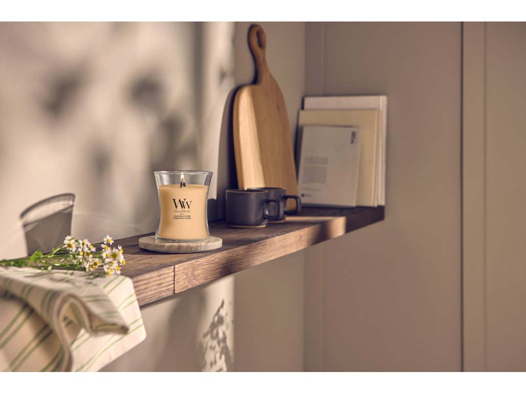 Menší, ale stále plná klidu a atmosféry. Střední svíčka WoodWick přináší pocit bezpečí a soustředění – dřevěný knot při hoření tiše praská a uvolňuje přírodní aroma, které zklidňuje mysl a prostor.Elegantní pastelové barvy a čistý design ladí s minimalistickým interiérem. Perfektní pro chvíle meditace, čtení nebo odpočinku.TIP: Rozpusťte svíčku vždy až ke kraji, nechejte jí hořet 3-4 hodiny