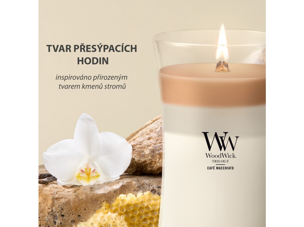 Velká váza WoodWick je stvořená pro chvíle, kdy chceš zpomalit a dopřát si klid inspirovaný přírodou. Díky svému objemu a ikonickému dřevěnému knotu vytváří hluboký, hřejivý zvuk praskajícího ohně, který uklidňuje a přirozeně ztišuje prostor. Organicky tvarovaná skleněná váza podporuje rovnoměrné hoření a umožňuje vůni pozvolna zaplnit místnost. Zapálení svíčky se mění v rituál, který pomáhá odpoutat se od ruchu dne a znovu se ukotvit v přítomném okamžiku. Velká váza je ideální pro dlouhé večery a otevřené prostory, kde chceš cítit teplo, harmonii a klid, které přináší propojení s přírodou.U svíček Trilogy se tři vrstvy vosku během hoření postupně propojují a plynule přecházejí jedna v druhou, čímž vzniká proměnlivý, ale harmonický smyslový zážitek. TIP: Pro rovnoměrné hoření nechte svíčku při každém zapálení rozpustit až ke kraji.
