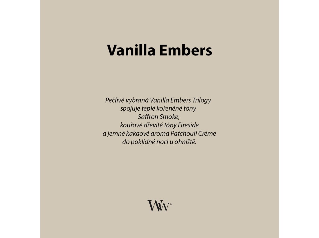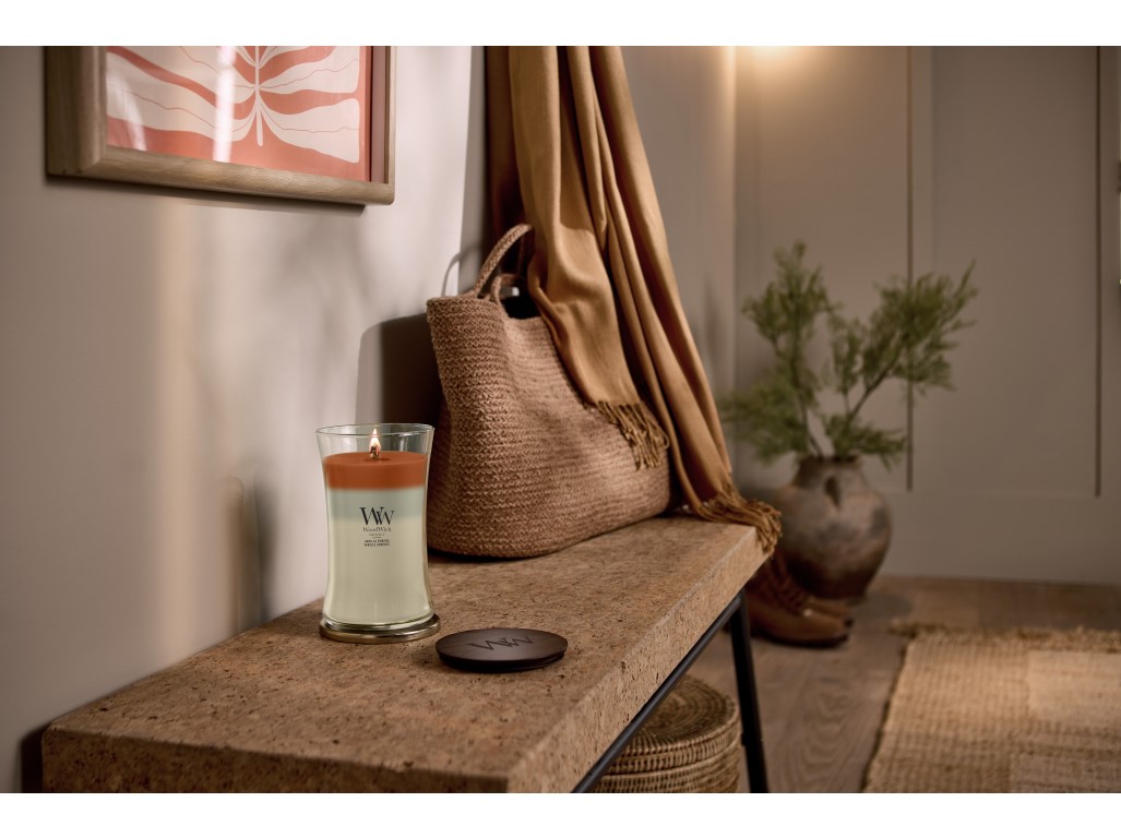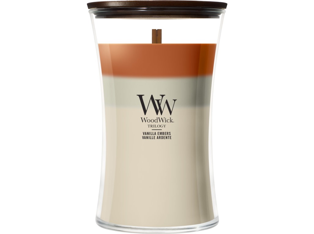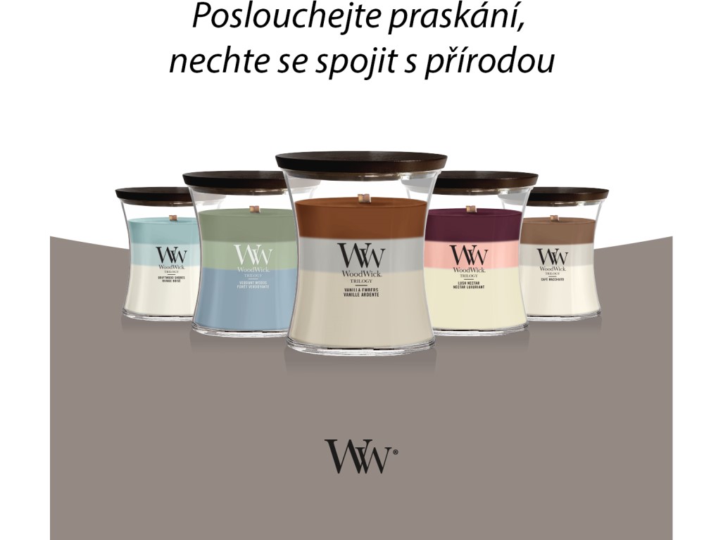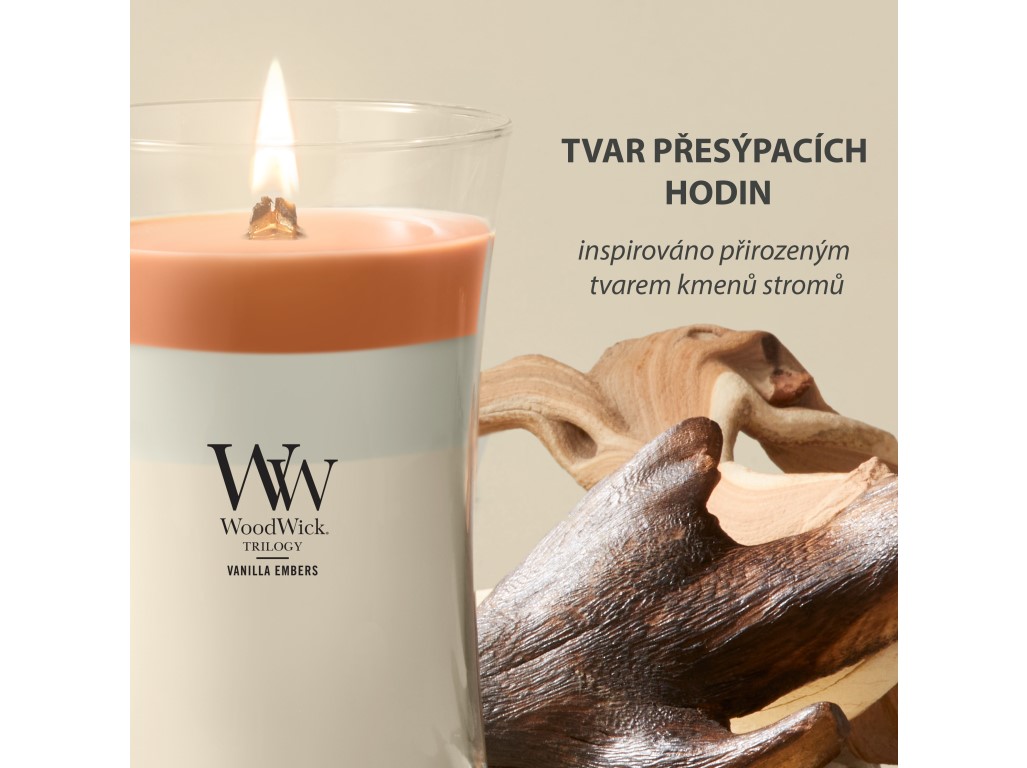 Velká váza WoodWick je stvořená pro chvíle, kdy chceš zpomalit a dopřát si klid inspirovaný přírodou. Díky svému objemu a ikonickému dřevěnému knotu vytváří hluboký, hřejivý zvuk praskajícího ohně, který uklidňuje a přirozeně ztišuje prostor. Organicky tvarovaná skleněná váza podporuje rovnoměrné hoření a umožňuje vůni pozvolna zaplnit místnost. Zapálení svíčky se mění v rituál, který pomáhá odpoutat se od ruchu dne a znovu se ukotvit v přítomném okamžiku. Velká váza je ideální pro dlouhé večery a otevřené prostory, kde chceš cítit teplo, harmonii a klid, které přináší propojení s přírodou.U svíček Trilogy se tři vrstvy vosku během hoření postupně propojují a plynule přecházejí jedna v druhou, čímž vzniká proměnlivý, ale harmonický smyslový zážitek. TIP: Pro rovnoměrné hoření nechte svíčku při každém zapálení rozpustit až ke kraji.