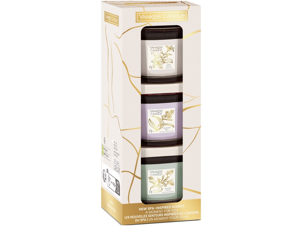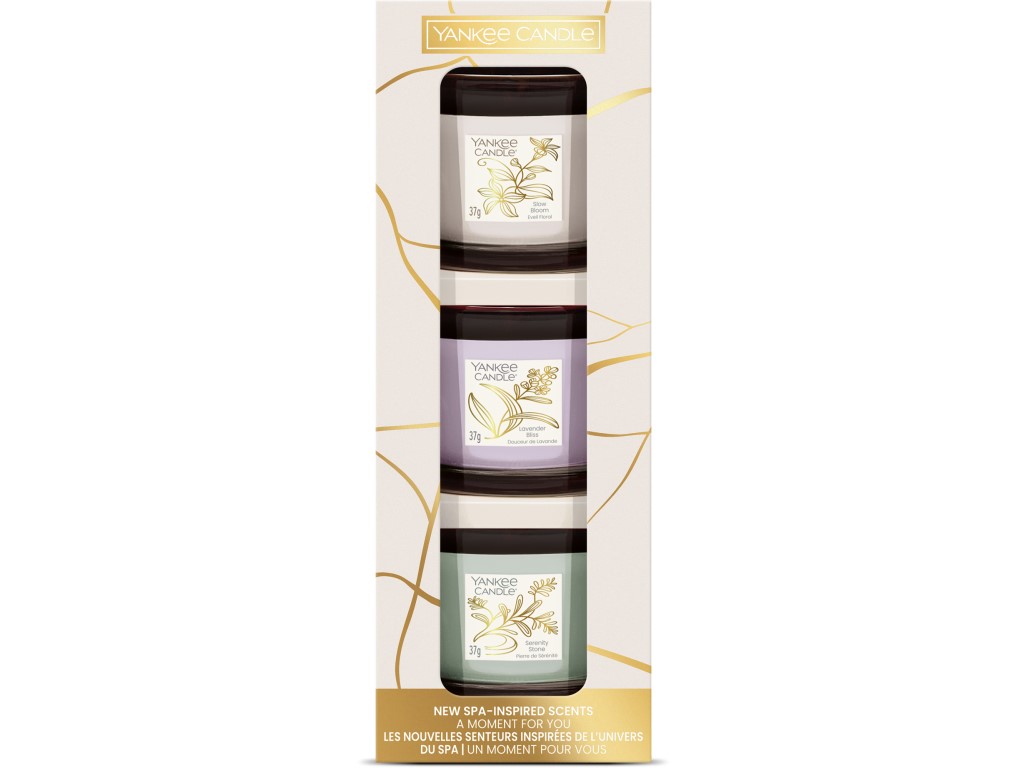 Sada tří mini plněných votivních svíček je ideální volbou pro objevování různých nálad a vůní. Lavender Bliss přináší uvolňující atmosféru inspirovanou klidem spa, Serenity Stone evokuje svěží mořský vánek a pocit hluboké relaxace a Slow Bloom zachycuje jemnost rozkvetlé zahrady plné pohody. Mini svíčky jsou skvělé jako testovací balení před nákupem větších svíček i jako milý dárek. Jsou vyrobeny z hladké směsi se sójovým voskem a kvalitními vonnými přísadami. Skleničky lze po vypálení znovu využít například jako svícínky na čajové svíčky.